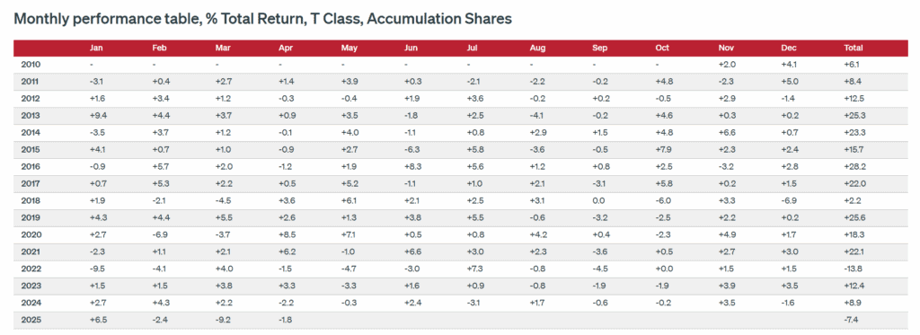 *Take note that this annualised return stated is measured using it’s T Acc Share class which is available to retail investors in the UK market. The R Share class will deliver a slightly lower return due to the slightly higher annual management fees. Here are the various charges depending on the share classes. The Share Class generally available via the ILP and Platforms in Singapore is the R Class
